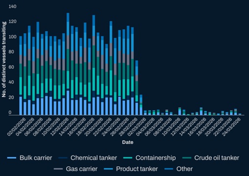 The Lloyd’s Market Association further reported on 23 March that only 111 cargo-carrying vessel transits above 10,000 dwt had been recorded from the start of March to the end of week commencing 16 March, and that ship movements through the Strait were largely sanctioned or shadow fleet tonnage. At the end of March, Bloomberg ship-tracking data was showing that average March traffic through the Strait had fallen to barely six vessels a day, compared with about 135 in normal conditions.